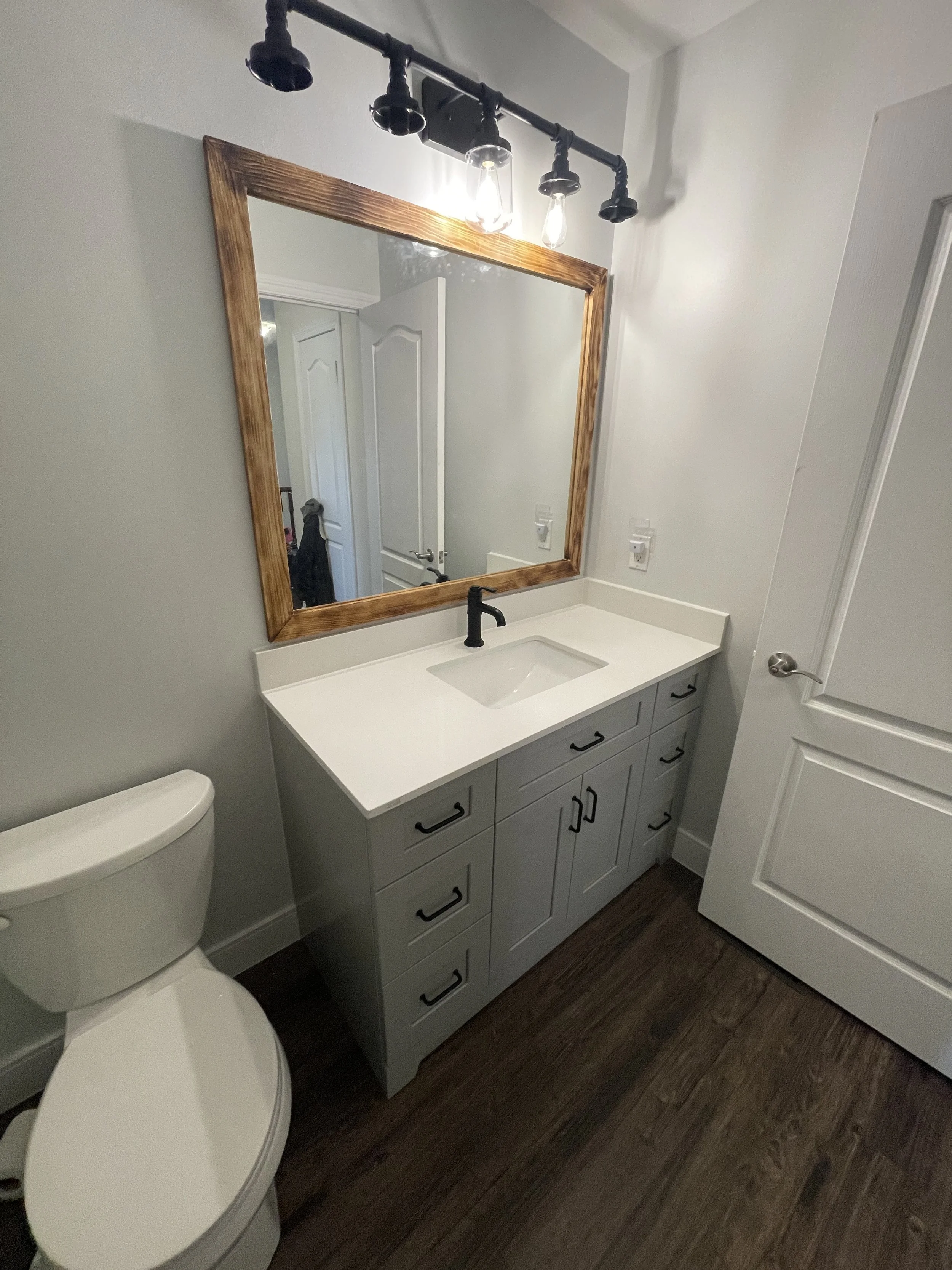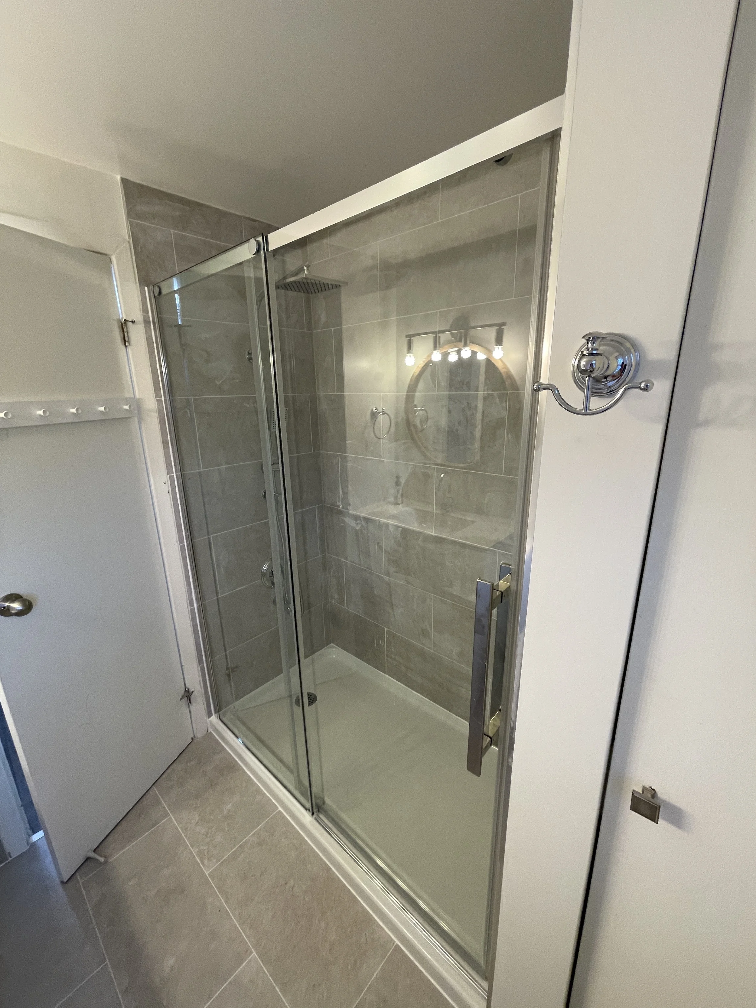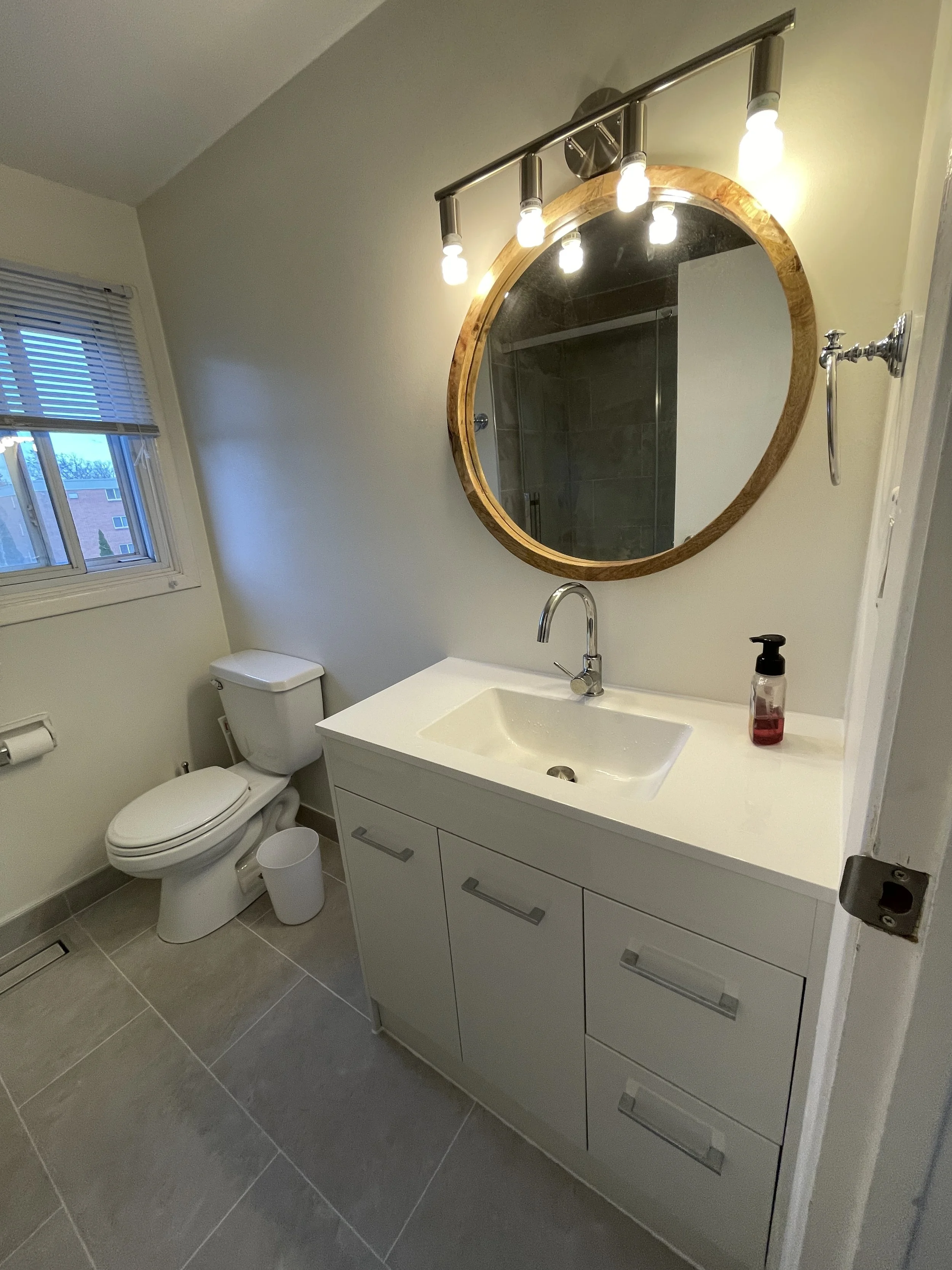 This beautifully renovated bathroom combines modern elegance with functional design. Featuring sleek fixtures, stunning tile work, and a spa-like atmosphere, it offers a perfect retreat for relaxation. Thoughtfully designed for both style and comfort, this space transforms daily routines into a luxurious experience, showcasing our commitment to creating truly iconic living environments.